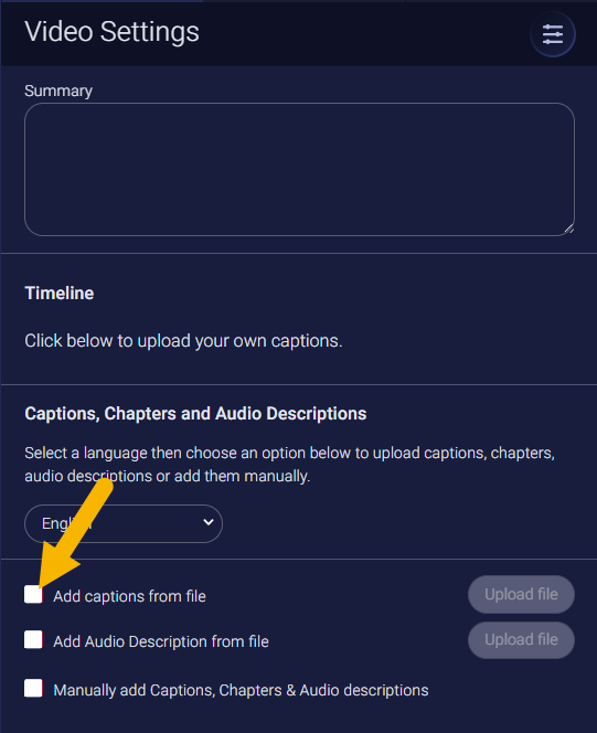 1. Scroll to the bottom of the Video Settings tab and select the Add captions from file checkbox, and then click the Upload file button next to it.