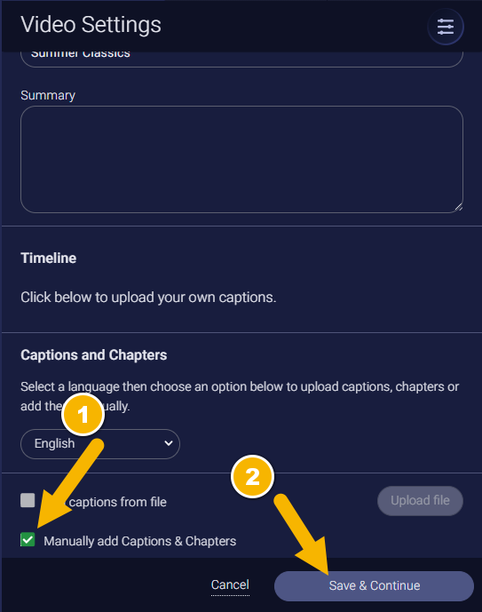 1. On Video Settings, select the checkbox next to Manually add Captions, & Chapters, and then click Save & Continue.