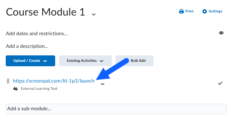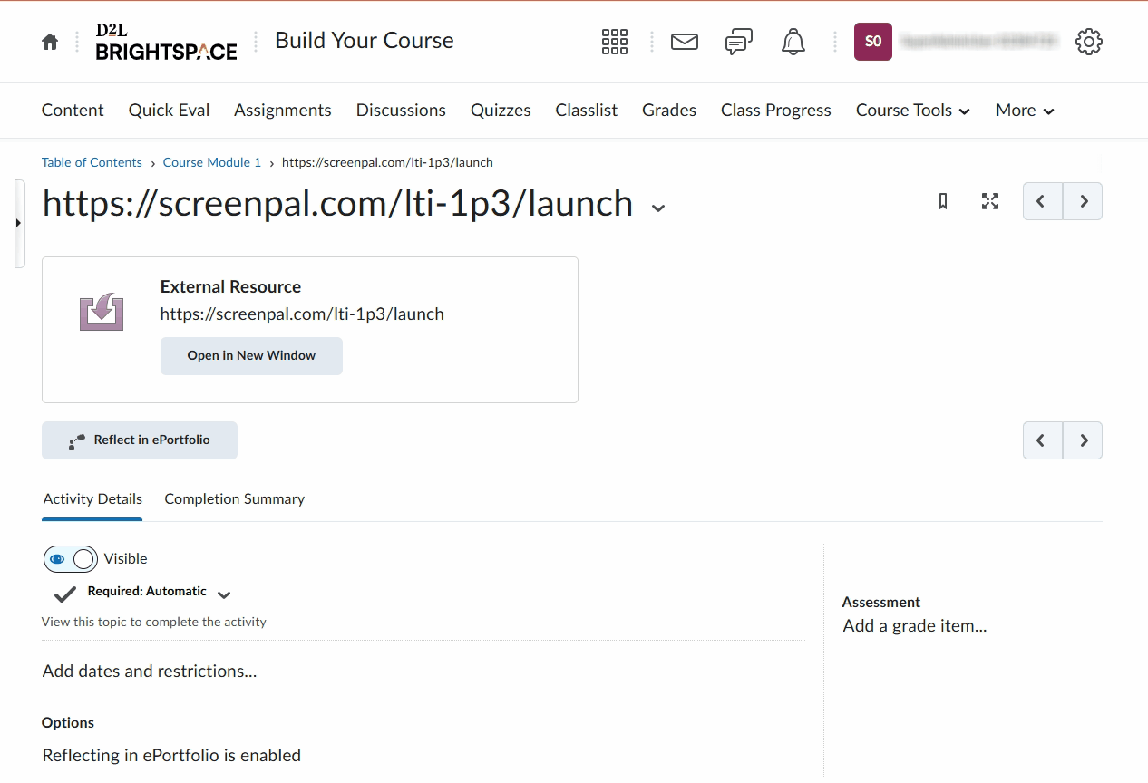 16. Click the placed link within the Instructions box. This opens a new browser tab with the ScreenPal content selection page displayed.
