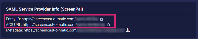 14. In ScreenPal, open the same Authentication menu from step 6. In the SAML Service Provider Info section, take note of the Entity ID and the ACS URL.