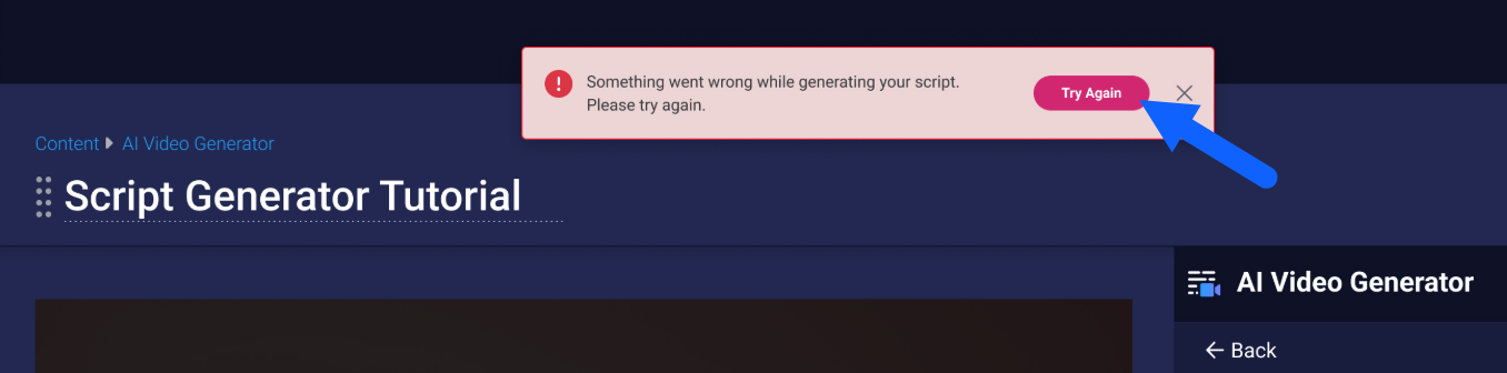 When you use the ScreenPal AI Video Generator to create original videos from a text prompt, you may see an error message displayed at the top of the page. Not to worry! When you see one of the following errors, just click Try Again to retry the script or video generation.