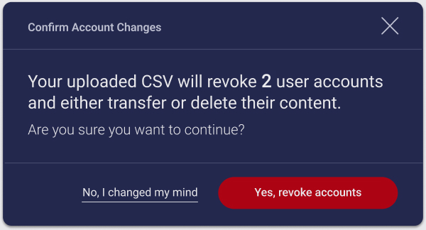 7. A message is displayed, asking you to confirm the account changes.  To proceed, click Yes, revoke accounts.  To cancel, click No, I changed my mind.