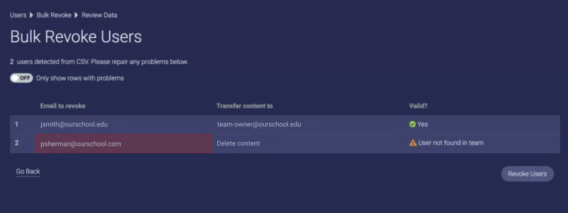 Result: You will then see a table that contains the email addresses of the users to revoke, the email address of the user the ScreenPal content is being transferred to, if applicable, and a column indicating whether the data in the row is valid. Invalid data is highlighted in red.  You can also toggle Only show rows with problems to on, to display only those rows that contain invalid data.