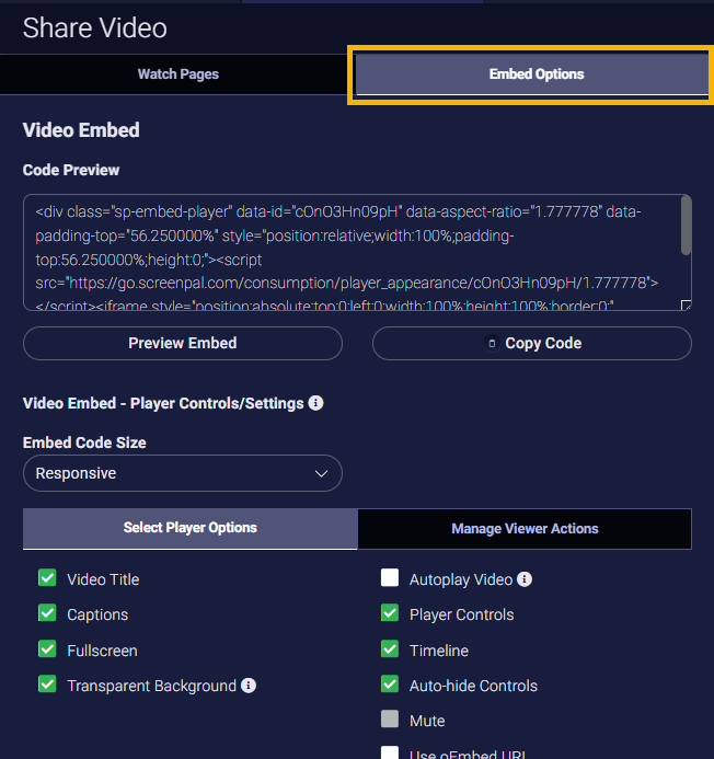 3. Click Embed Options to display the Video Embed code options.