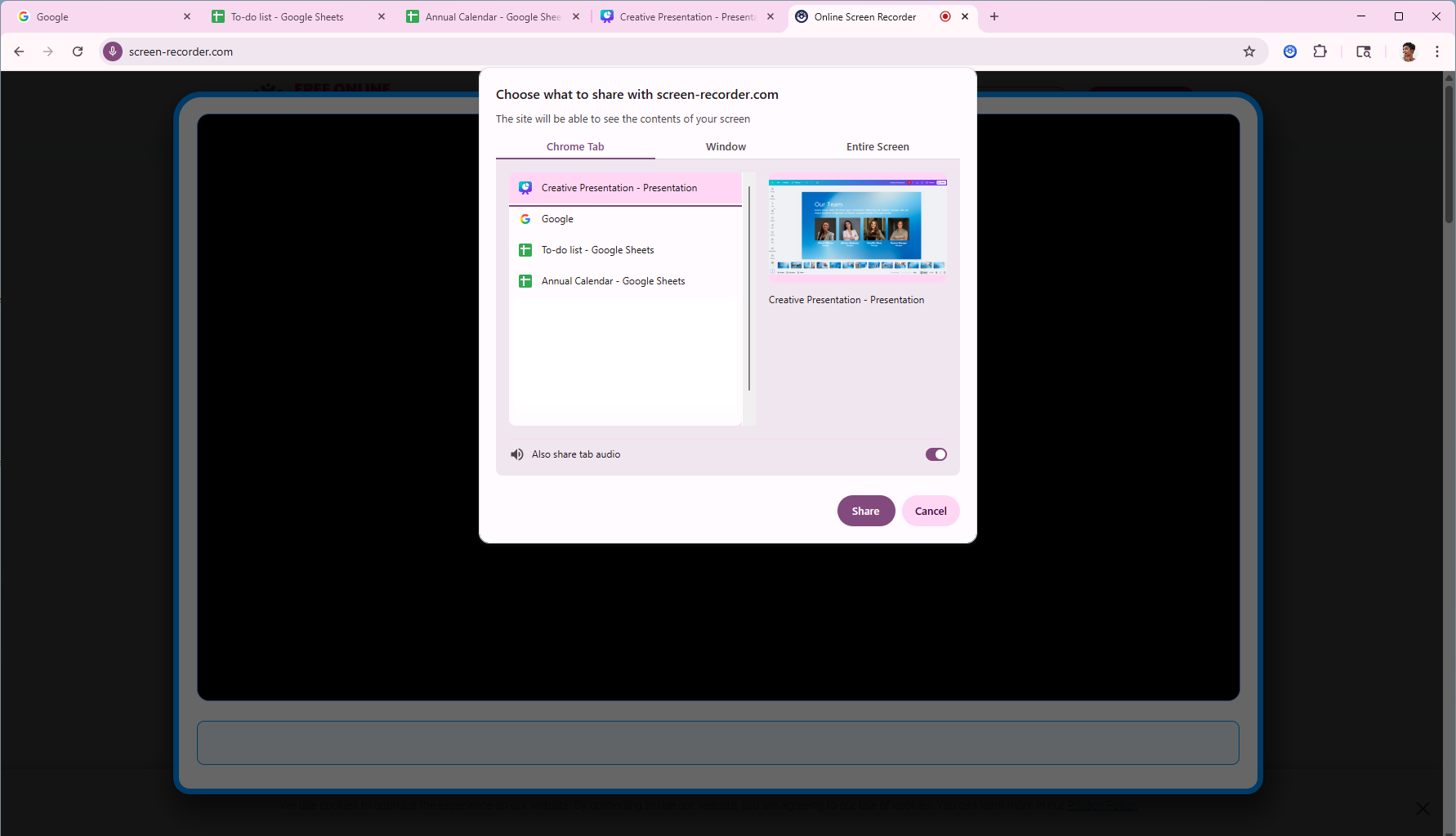 3. Choose what you would like to record: A specific tab, a specific window, or your entire screen. Click Share.