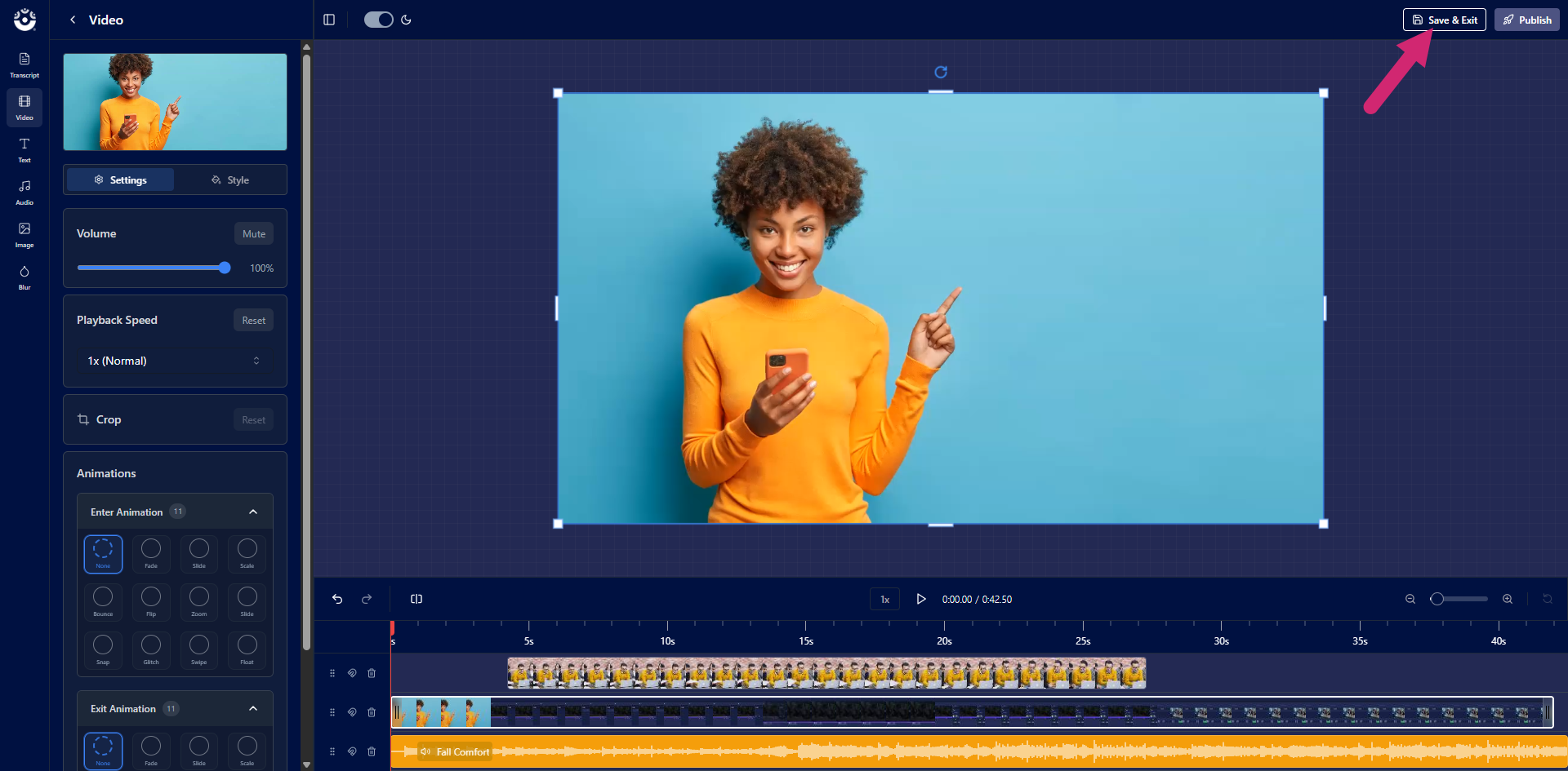 To save an edited video without publishing it, click the Save & Exit button at the top of the page.