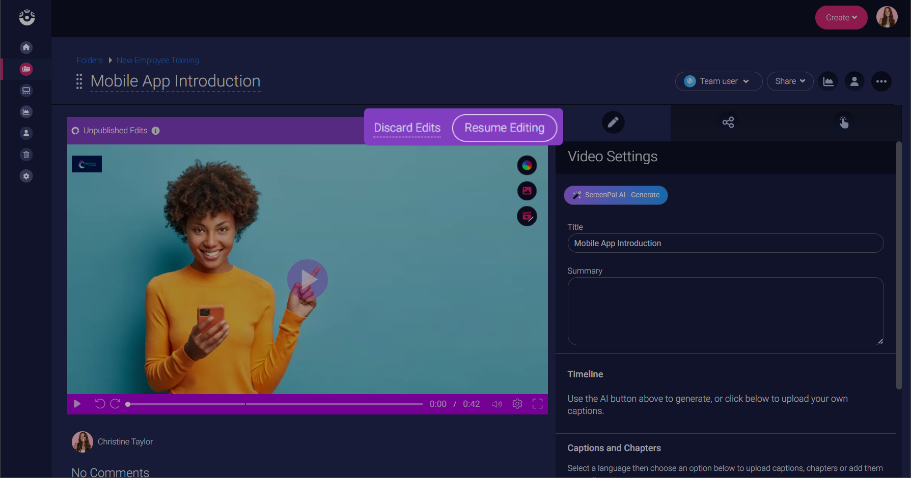 This saves your unpublished edits and returns you to the Video Settings tab in your ScreenPal Hosting account.