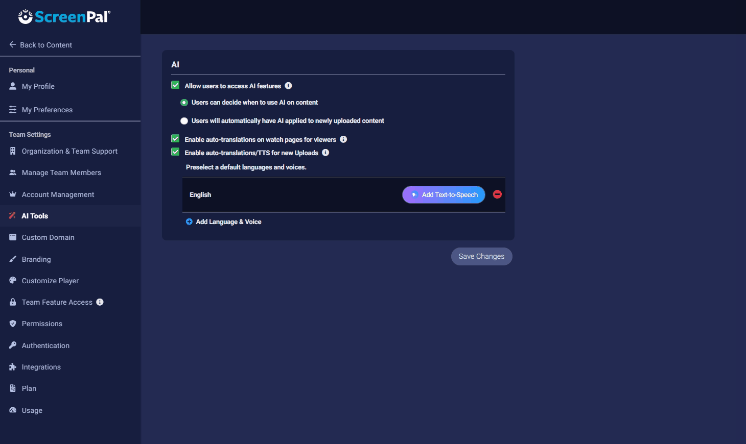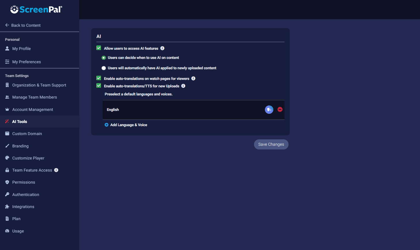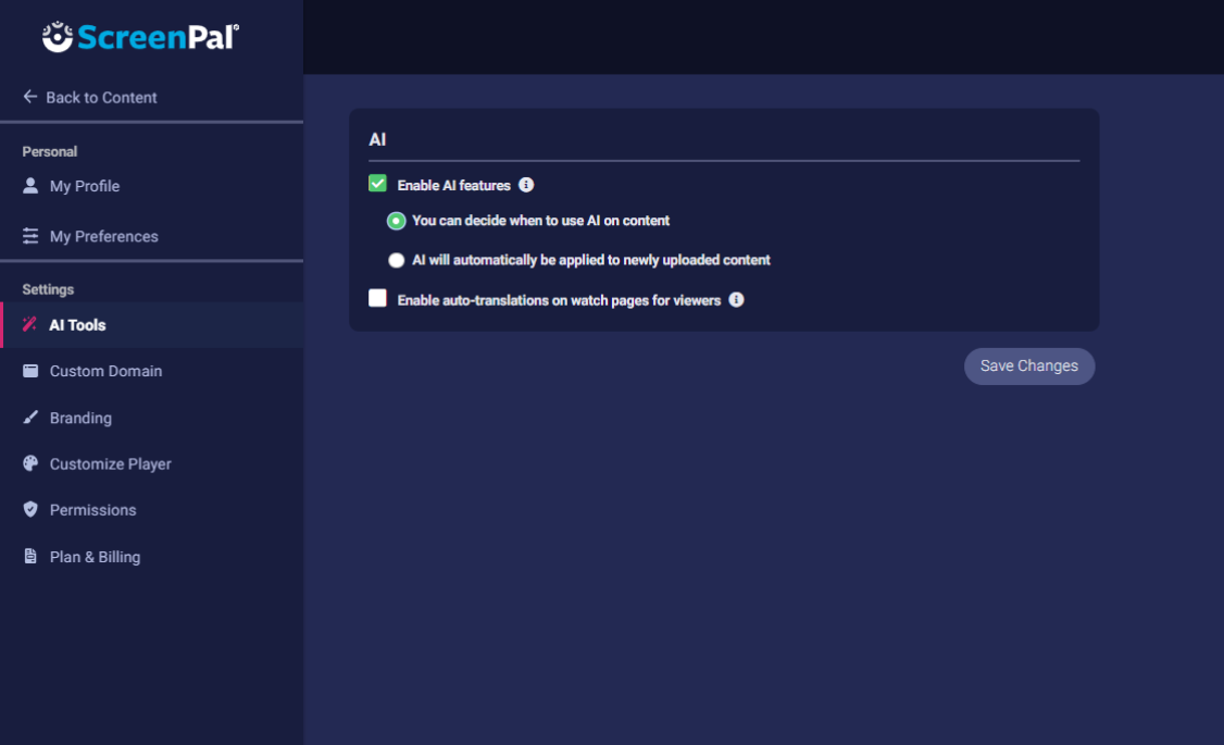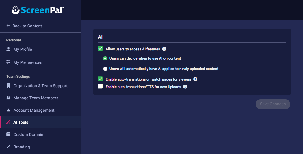 - To allow members of your team to decide when to use ScreenPal AI and apply it manually to their videos, select Users can decide when to use AI on content.