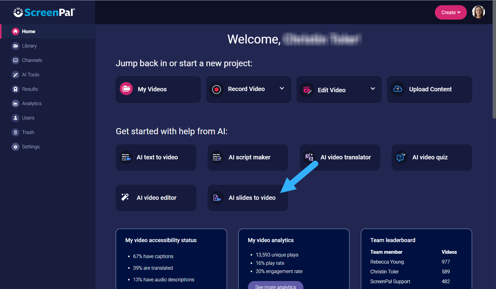 To convert your slide presentation into a video, log into your ScreenPal Hosting account. From the Home page, click AI slides to video.