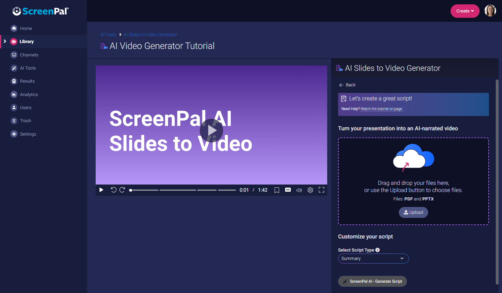 From here you can upload your slides presentation in PDF or PPTX format, select the script type, and then click Generate Script. When you are happy with your script, you can transform your slides into an editable, shareable ScreenPal video.