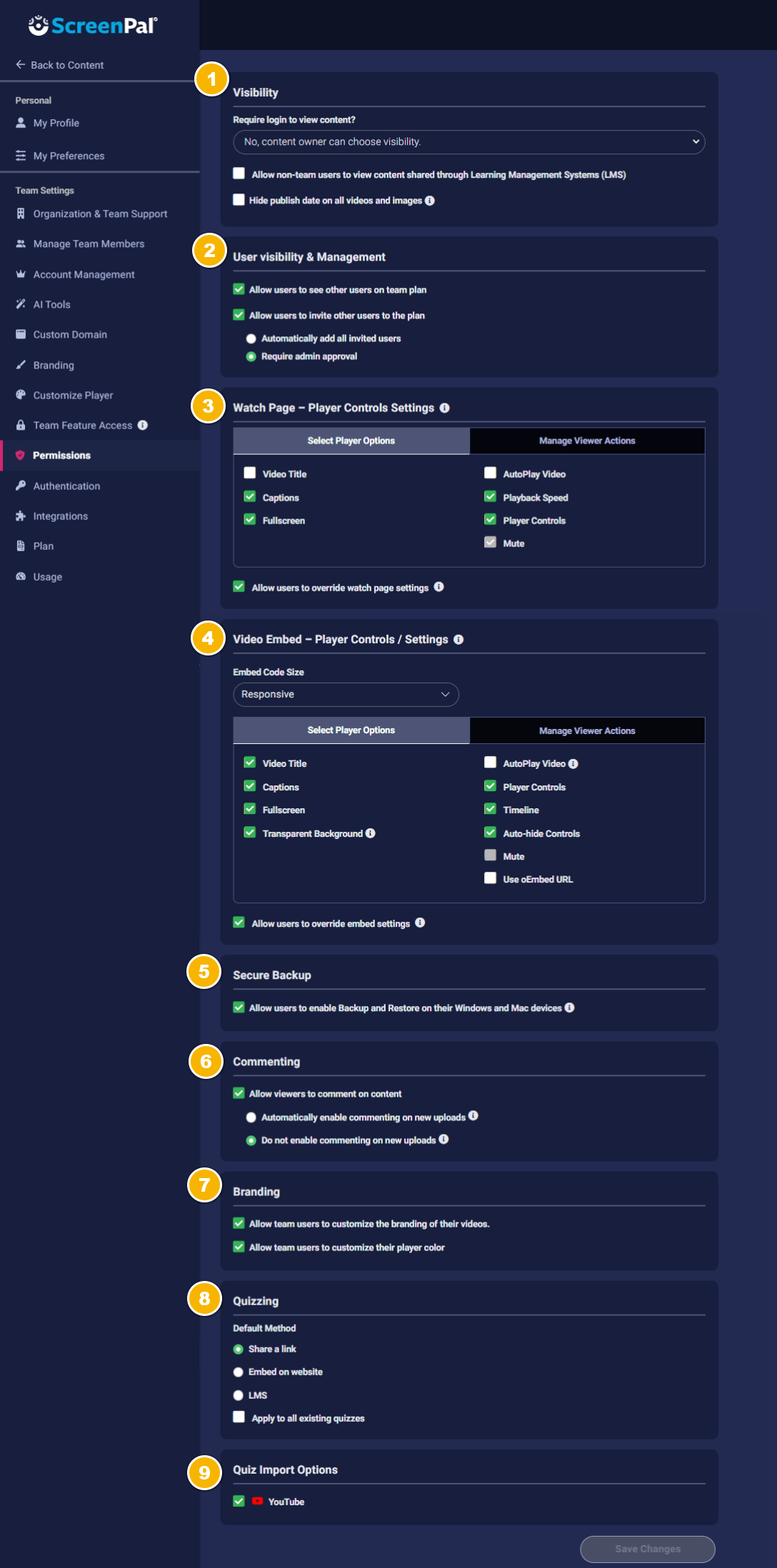 As the Owner or Administrator of a Team Plan (with the exception of legacy Team Deluxe plans), you have several settings available for configuration in ScreenPal Hosting. These settings enable you to personalize your viewers' experience and determine how team members can share content and use the ScreenPal tools.