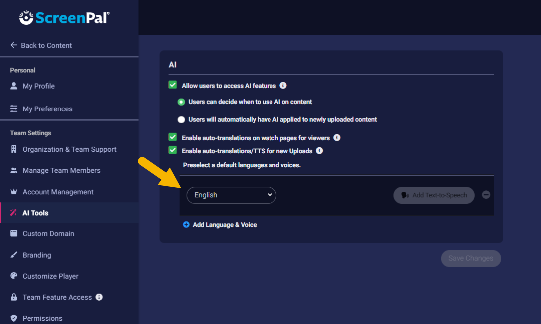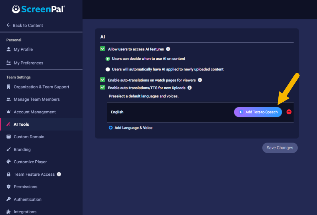AS the Owner or Administrator of a Team Plan, when you enable ScreenPal AI for your team, you can choose to automatically generate text-to-speech narration in multiple languages for videos uploaded to ScreenPal Hosting by your team members. In order for this feature to work, videos need to be uploaded from the ScreenPal desktop app with a transcript, or must include audible and intelligible original narration.