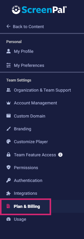 2. From the menu in the Settings area, click Plan & Billing in the menu.